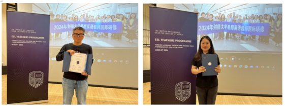 2024年暑期,张健、杨雪两位教师参加了由英国剑桥大学Eos教育中心与外语教学与研究出版社联合举办的2024年剑桥大学暑期英语教师国际研修班。研修课程覆盖五大主题,分别是ESL and Technology, Introduction to Linguistics, Cambridge T-SEDA Package, Cambridge Oracy Package, Sociocultural Issues in ESL。来自剑桥大学现代和中世纪语言与语言学学院的资深教授与高级研究员为研修教师提供了丰富的学术资源和全新的研究视角。