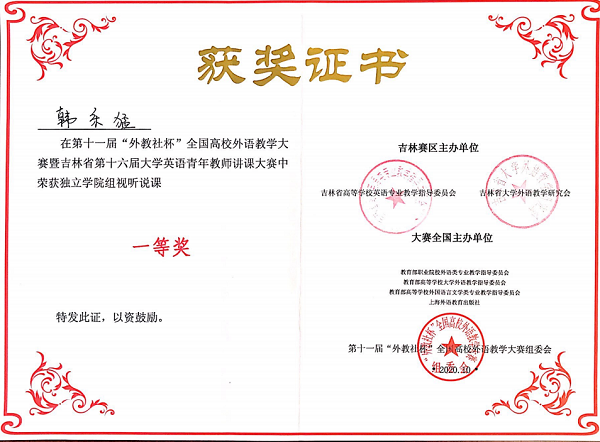 我校韩乐猛老师在吉林省第十六届大学英语青年教师讲课大赛中荣获一等奖