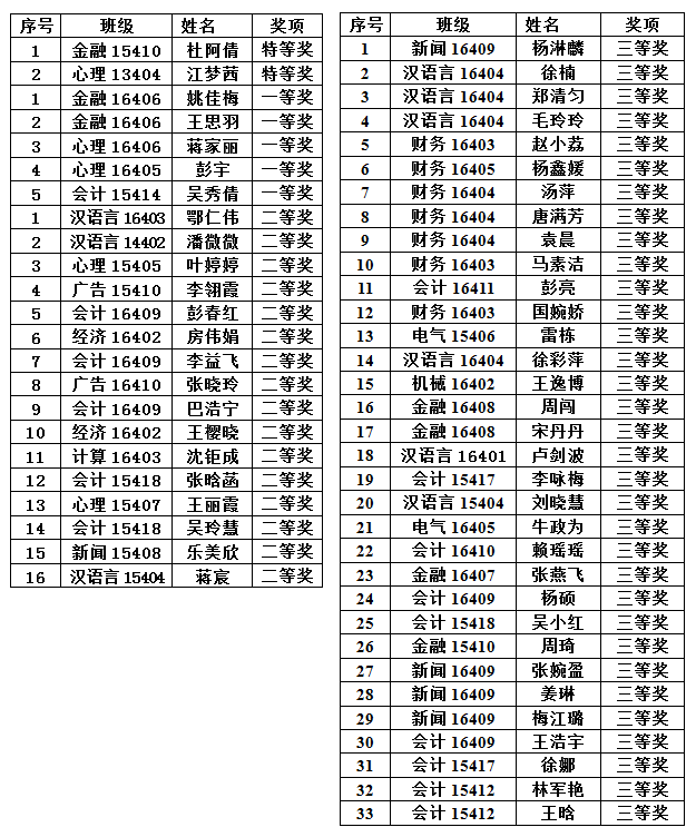 2016年9月27日中午12:00-13:00,我院2016“外研社杯”全国英语写作大赛初赛落下帷幕,本次比赛由公共外语教研部承办。经过广泛宣传,精心组织,积极动员,最终有651多名同学报名参加了比赛。竞赛结束后立即组织我部教师进行阅卷。经过严格细致的评阅,写作比赛评选出一等奖5名、二等奖16名、三等奖33名。与此同时获得写作比赛特等奖的杜阿倩(金融15410 指导教师翟卉欣),江梦茜(心理13404指导教师吴影)将代表我院参加10月29日上午在吉林大学举办的2016“外研社杯”全国英语写作大赛吉林省复赛。现将初赛获奖名单公布如下: