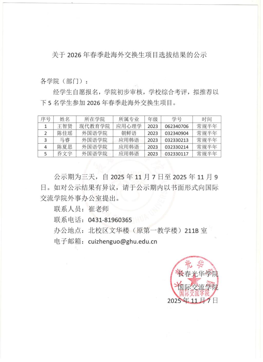 【公示公告】关于2026年春季赴海外交换生项目选拔结果的公示